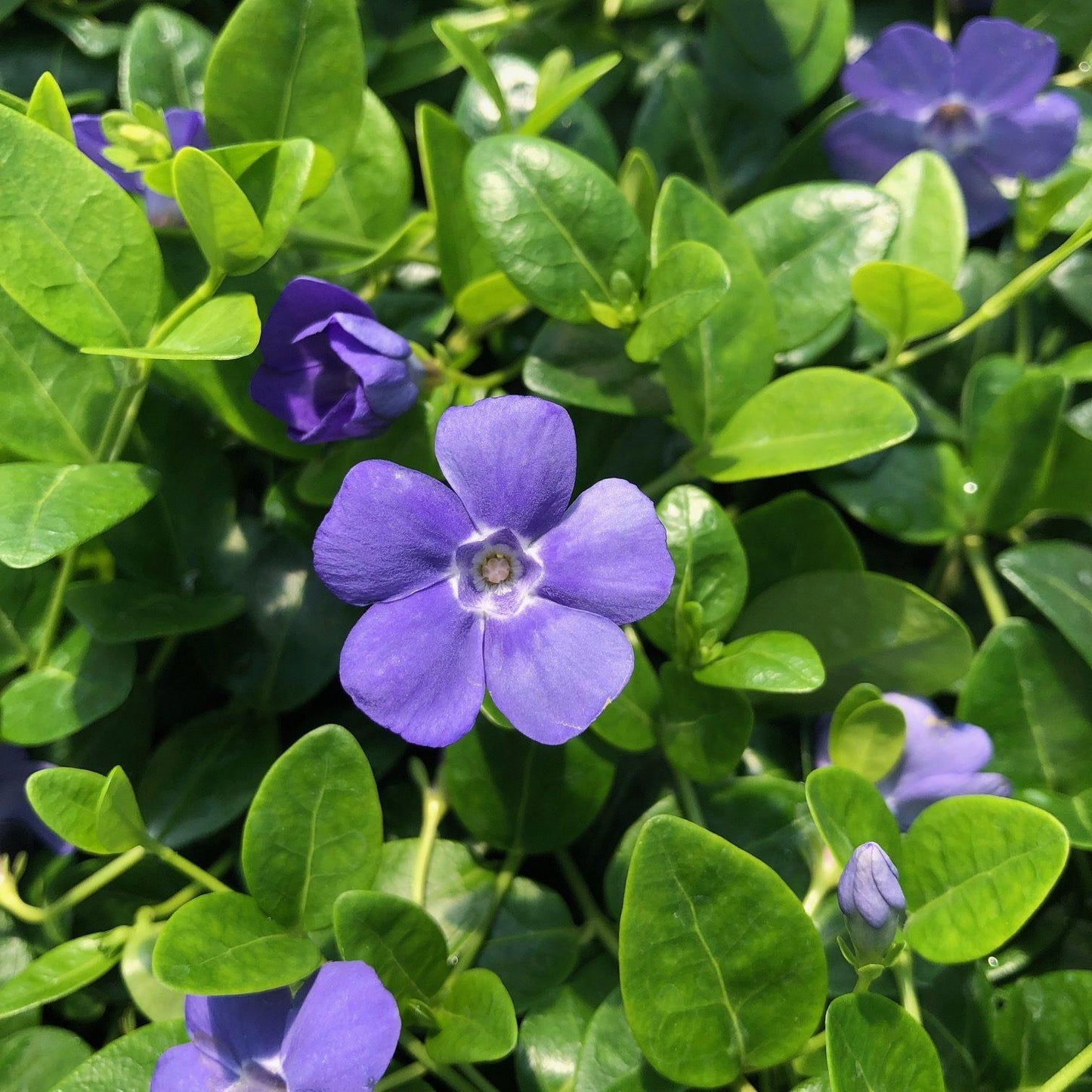 Vinca minor 'Bowles', commonly known as Bowles' Myrtle, is a vigorous, evergreen groundcover with glossy, dark green leaves and charming periwinkle-blue flowers. This low-maintenance plant is ideal for covering large areas and suppressing weeds.