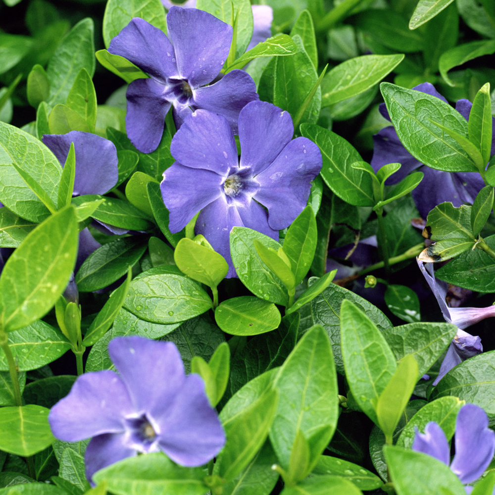 Vinca minor 'Bowles', commonly known as Bowles' Myrtle, is a vigorous, evergreen groundcover with glossy, dark green leaves and charming periwinkle-blue flowers. This low-maintenance plant is ideal for covering large areas and suppressing weeds.
