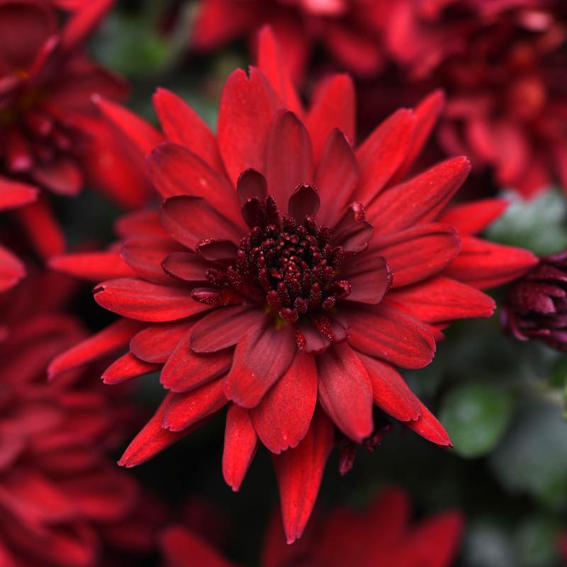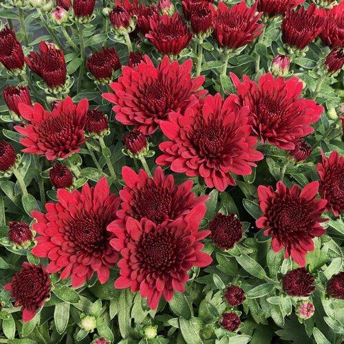The Mum, Red Lava Red, also known as 'Lava Red' Garden Mum, is a vibrant flowering plant known for its fiery red blooms. This perennial is a favorite for autumn gardens, providing a burst of color when many other plants are fading. Its compact growth habit makes it ideal for borders and containers.
