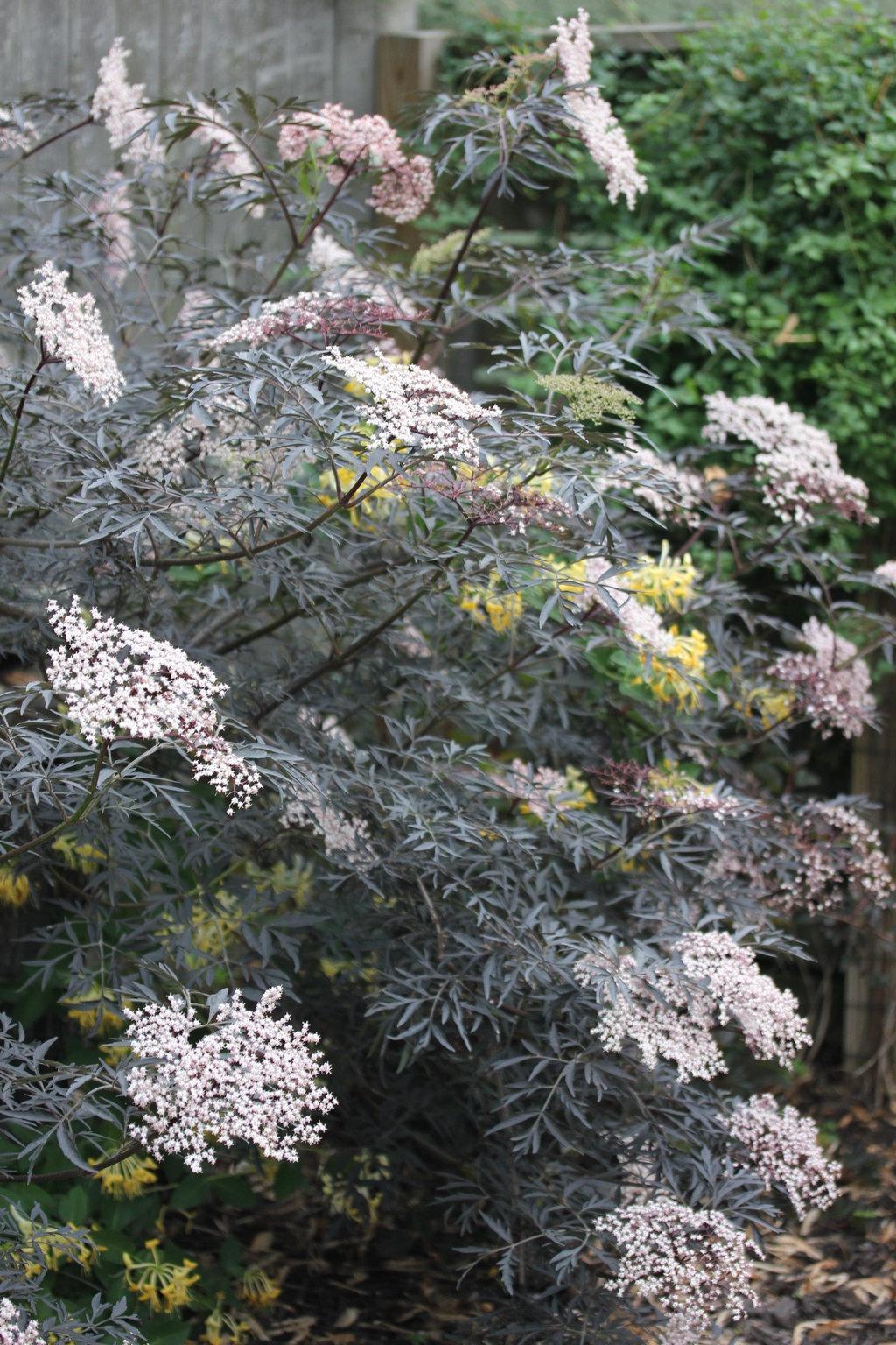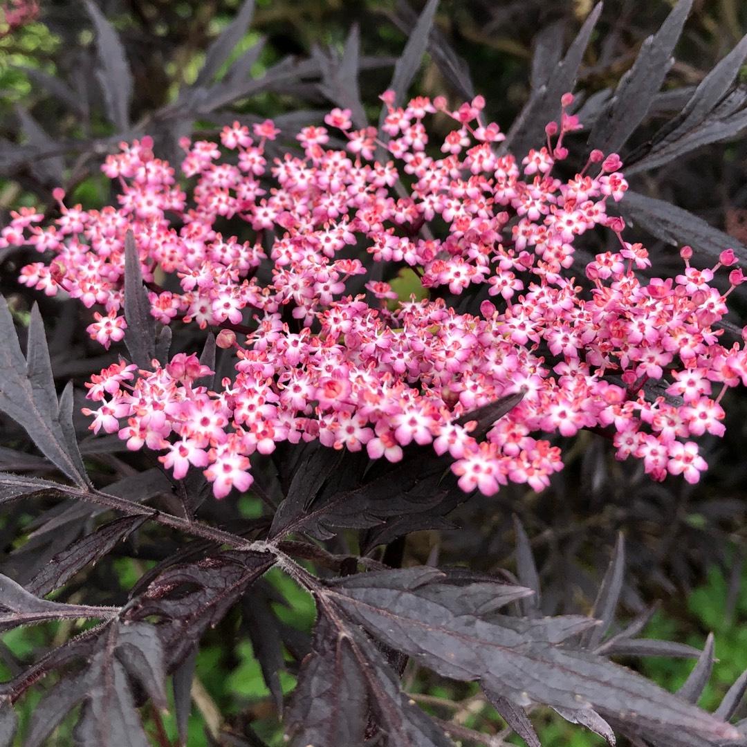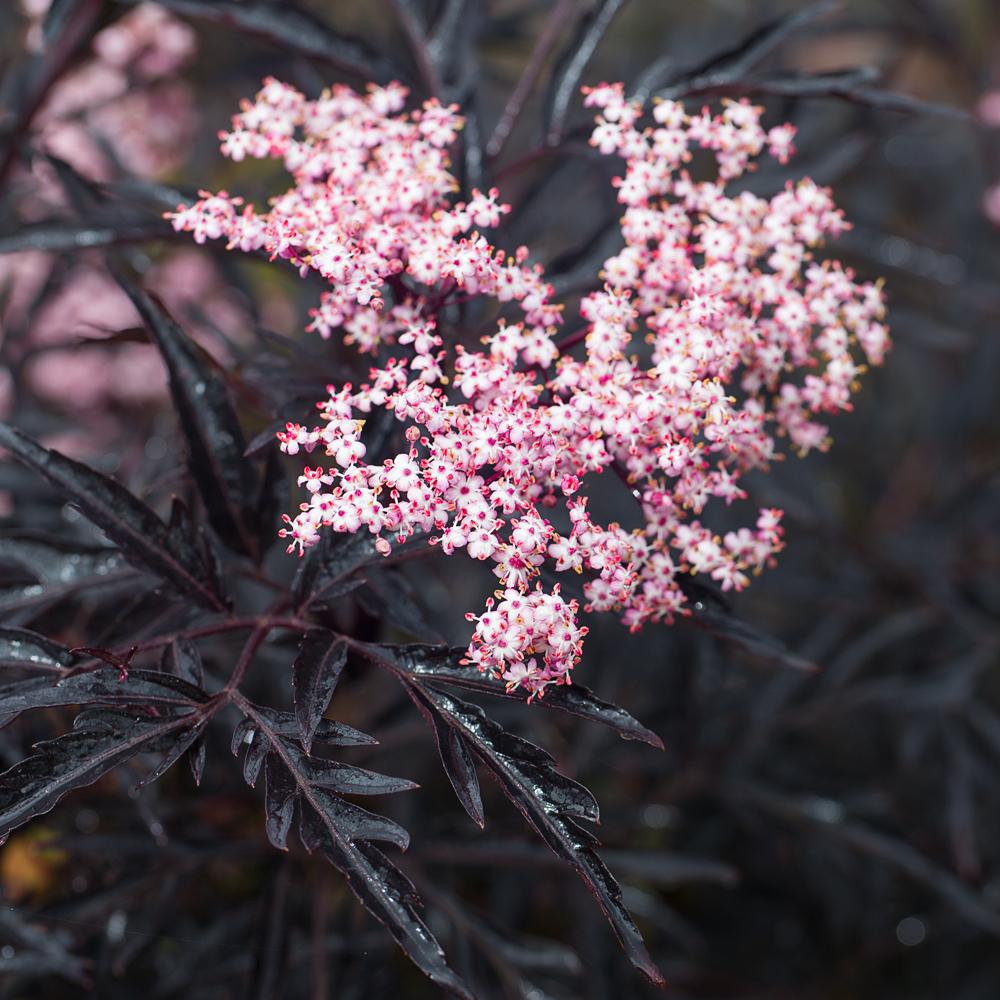 Sambucus nigra 'Black Lace' is a striking deciduous shrub known for its deeply cut, dark purple-black foliage that resembles the delicate lace of a Japanese maple. In early summer, it produces large clusters of pinkish-white flowers that contrast beautifully with its dark leaves. These flowers are followed by small, glossy black berries that are attractive to wildlife.