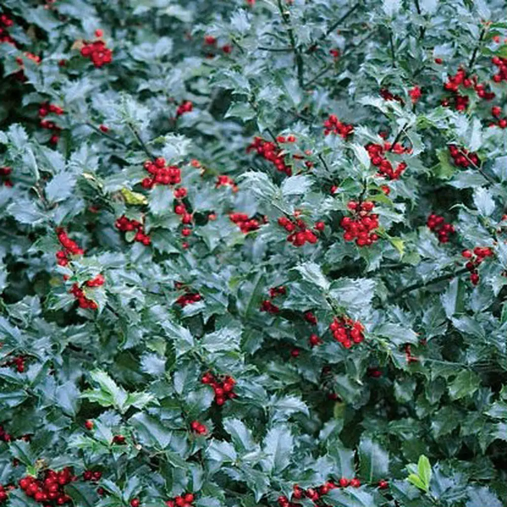 Ilex meserveae 'Blue Maid', commonly known as 'Blue Maid' Meserve Holly, is a hardy evergreen shrub known for its glossy, dark blue-green leaves and bright red berries. This plant is a popular choice for hedges and borders, providing year-round interest and a splash of color in the winter months.