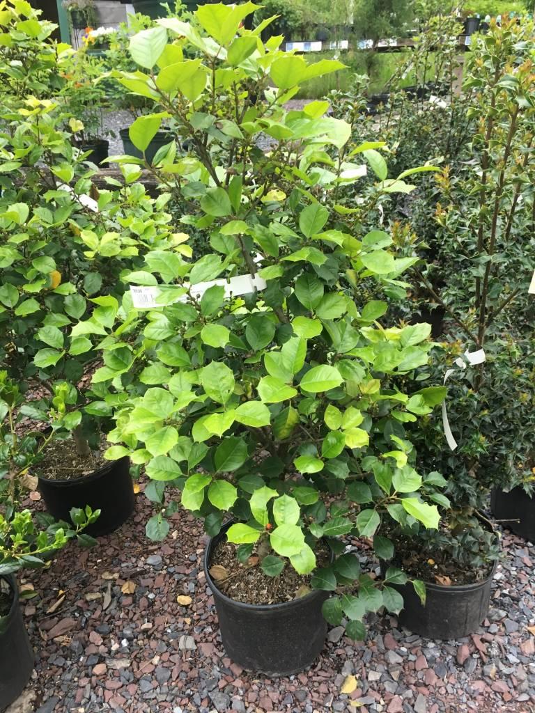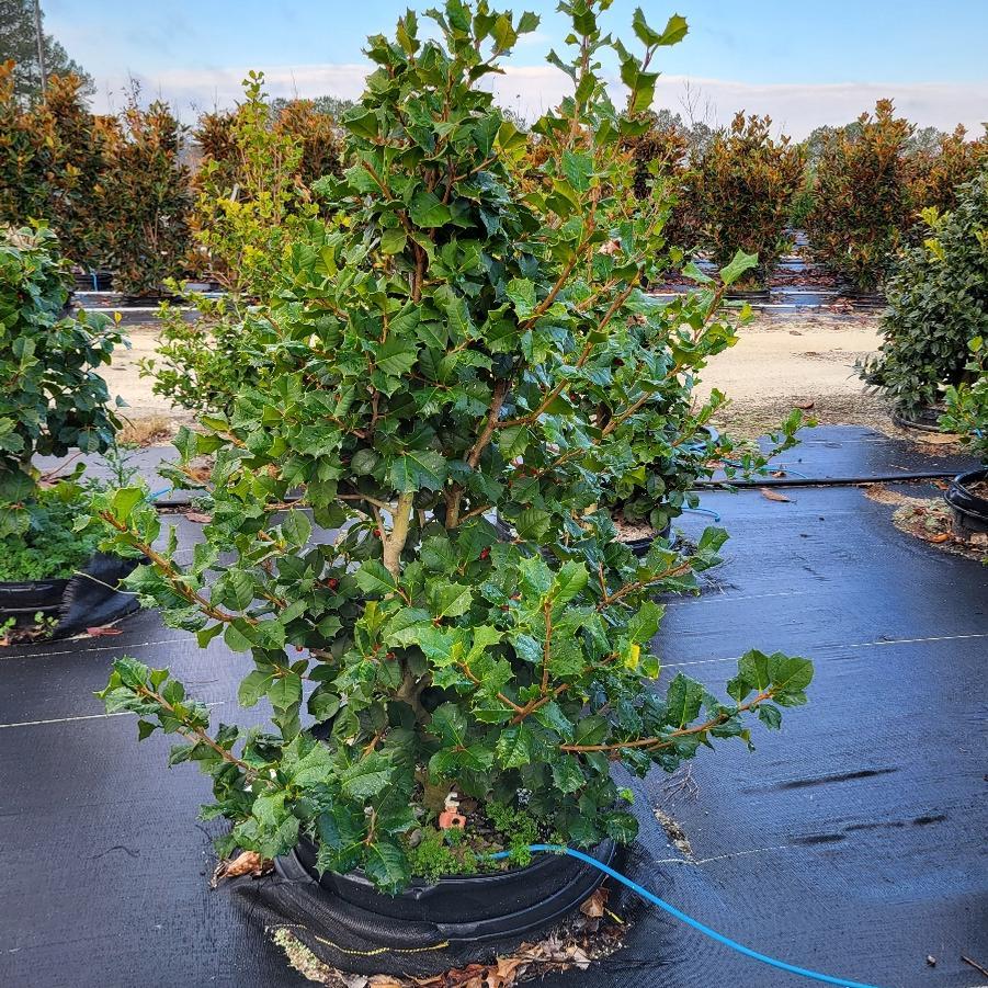 Ilex opaca 'Satyr Hill', commonly known as 'Satyr Hill' American Holly, is a robust evergreen tree known for its attractive glossy green leaves and bright red berries. This cultivar is particularly valued for its dense foliage and pyramidal shape, making it a standout in any landscape.