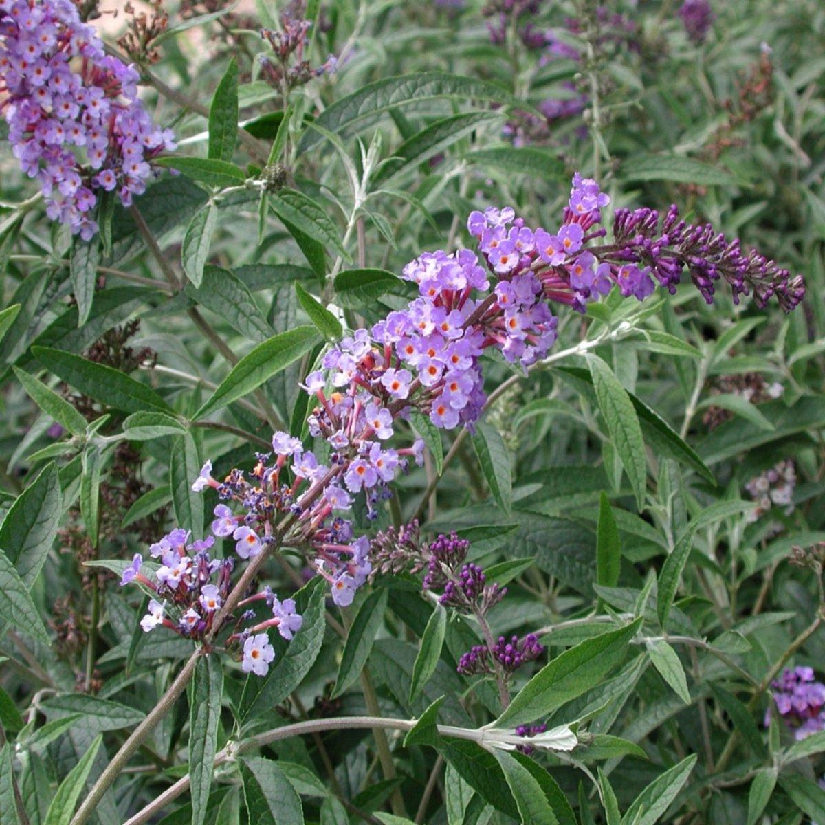 Buddleia davidii 'Nanho Purple', commonly known as the 'Nanho Purple' Butterfly Bush, is a deciduous shrub known for its striking purple flowers and its ability to attract butterflies and other pollinators. It features long, arching branches with narrow, gray-green leaves and produces dense clusters of fragrant, tubular flowers from summer to fall.