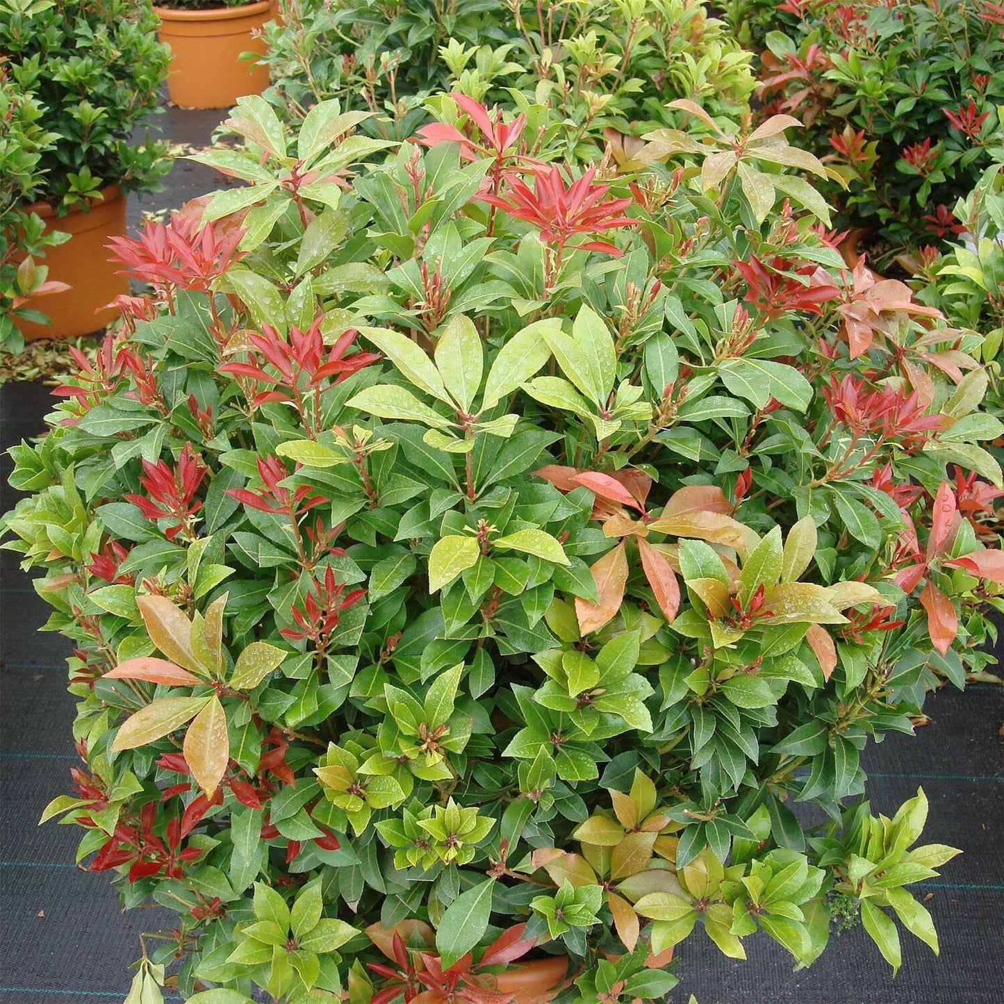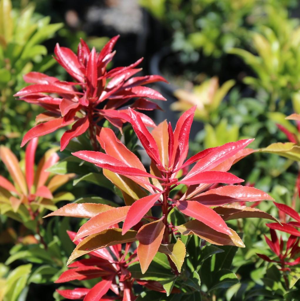 Pieris japonica 'Mountain Fire' is a striking evergreen shrub known for its vibrant red new growth that matures to a glossy green. This plant offers year-round interest with its showy white flowers in spring and attractive foliage throughout the year.