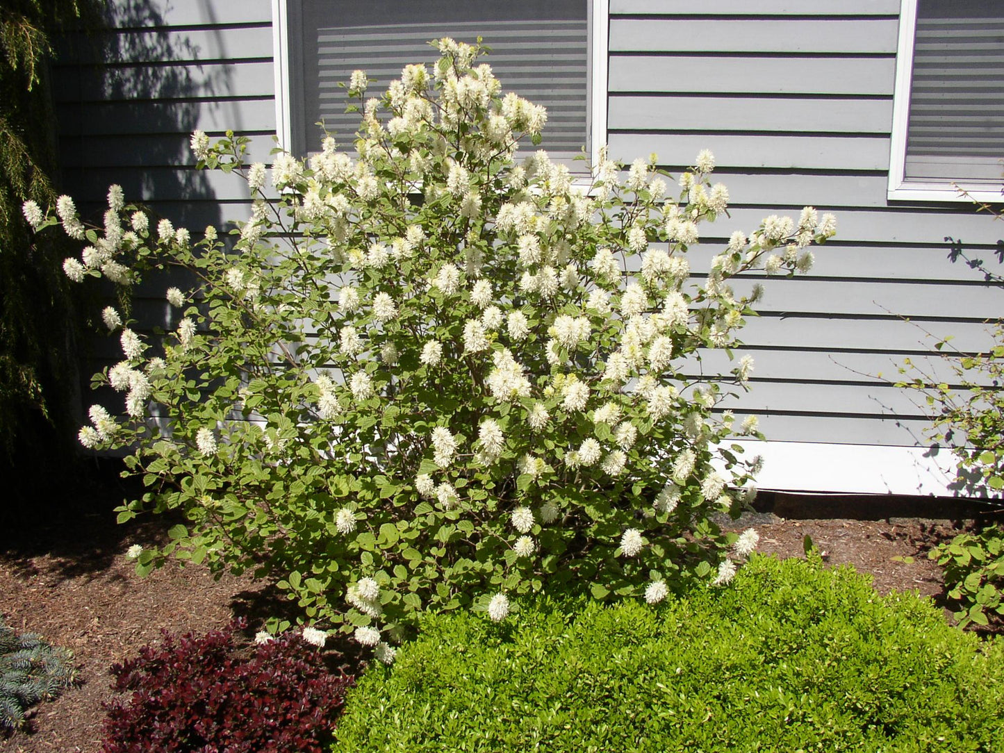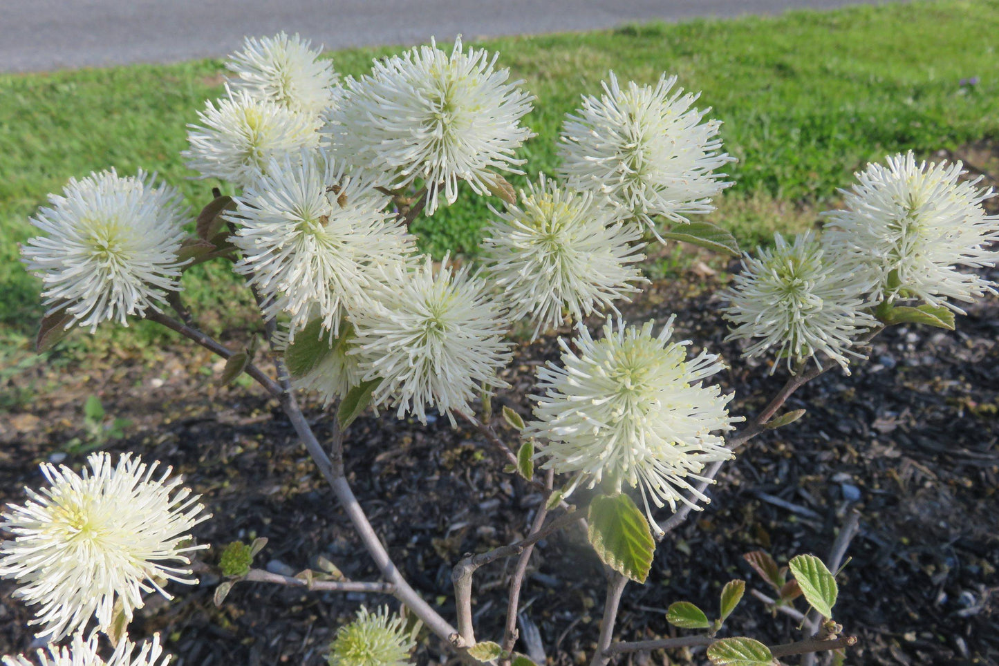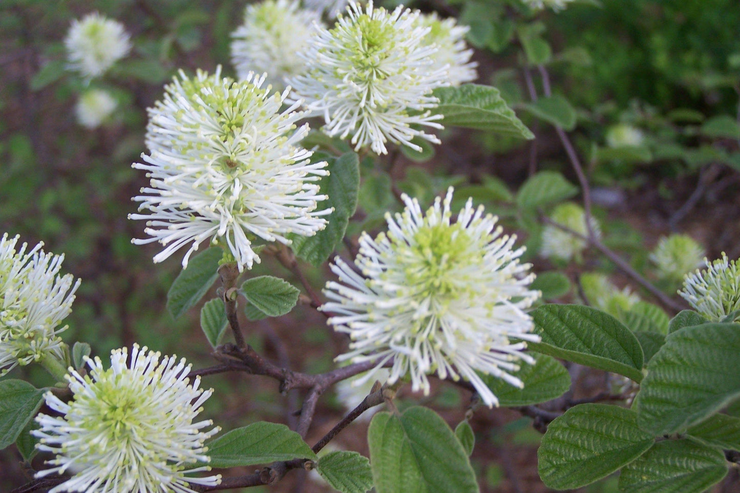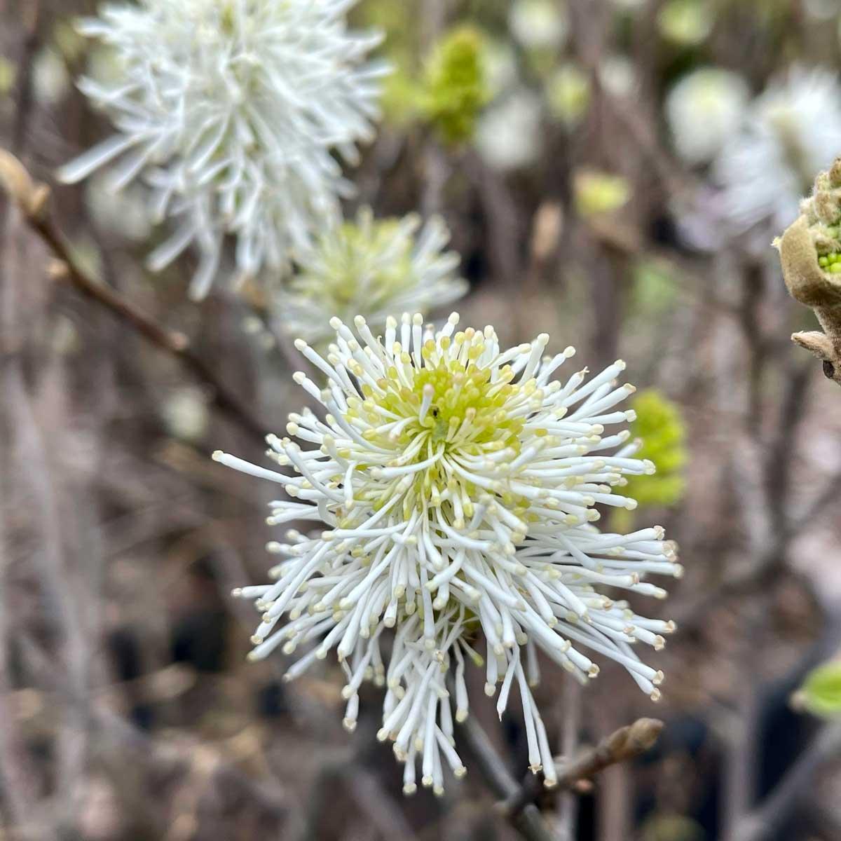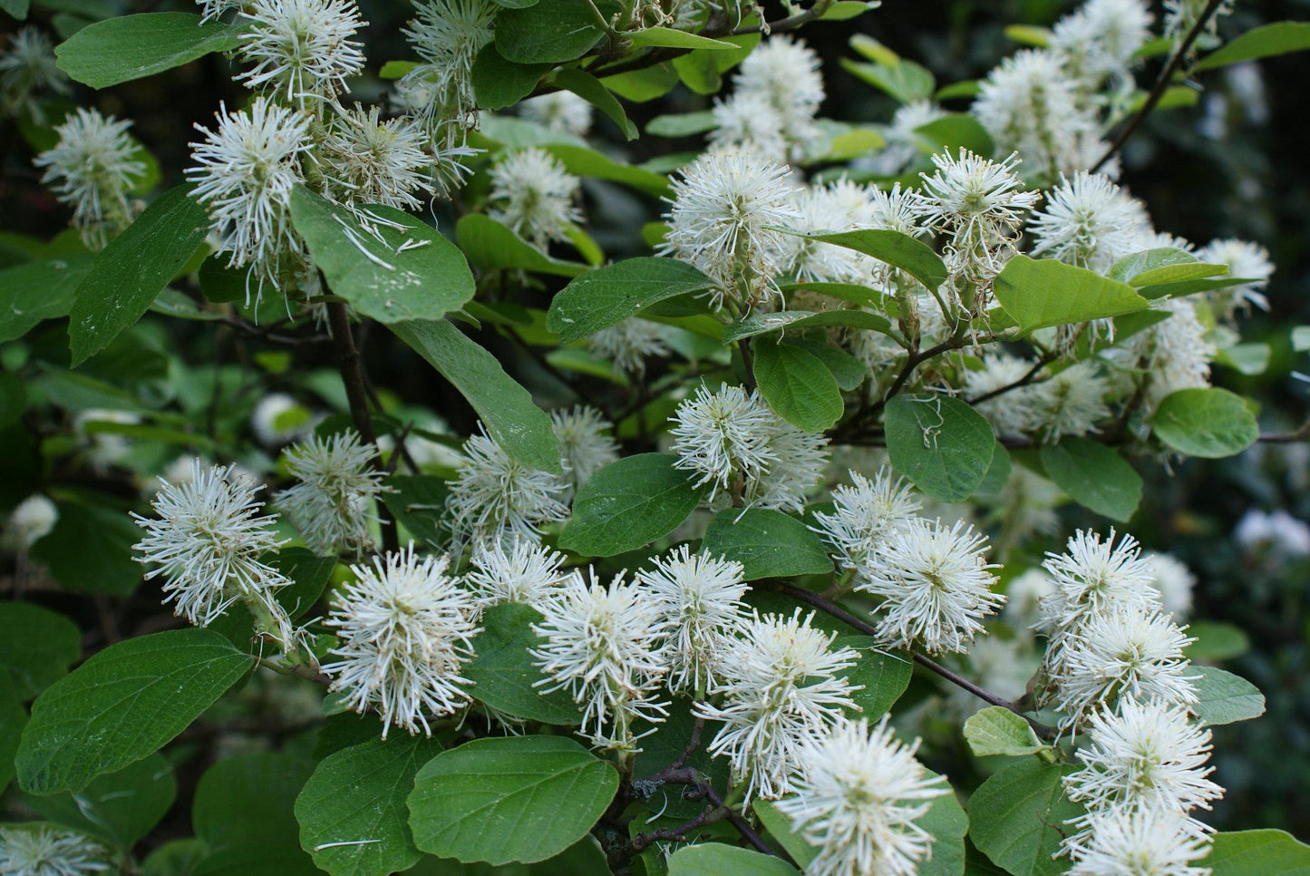 Fothergilla gardenii, commonly known as Dwarf Fothergilla, is a deciduous shrub native to the southeastern United States. It is admired for its striking bottlebrush-like white flowers in spring and vibrant fall foliage that ranges from yellow to orange to red.