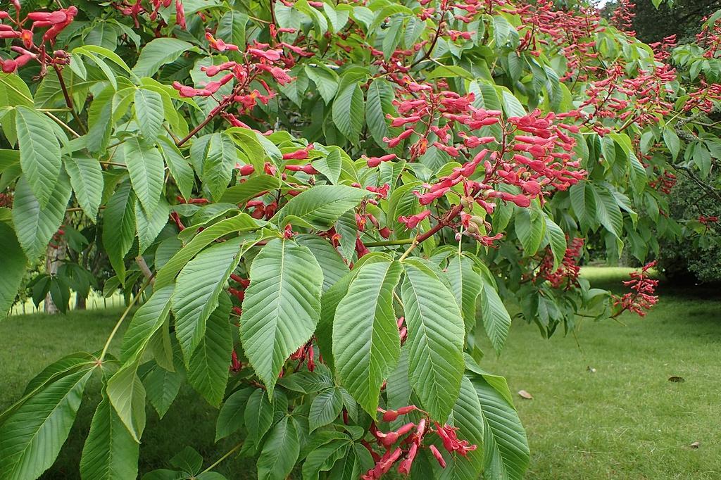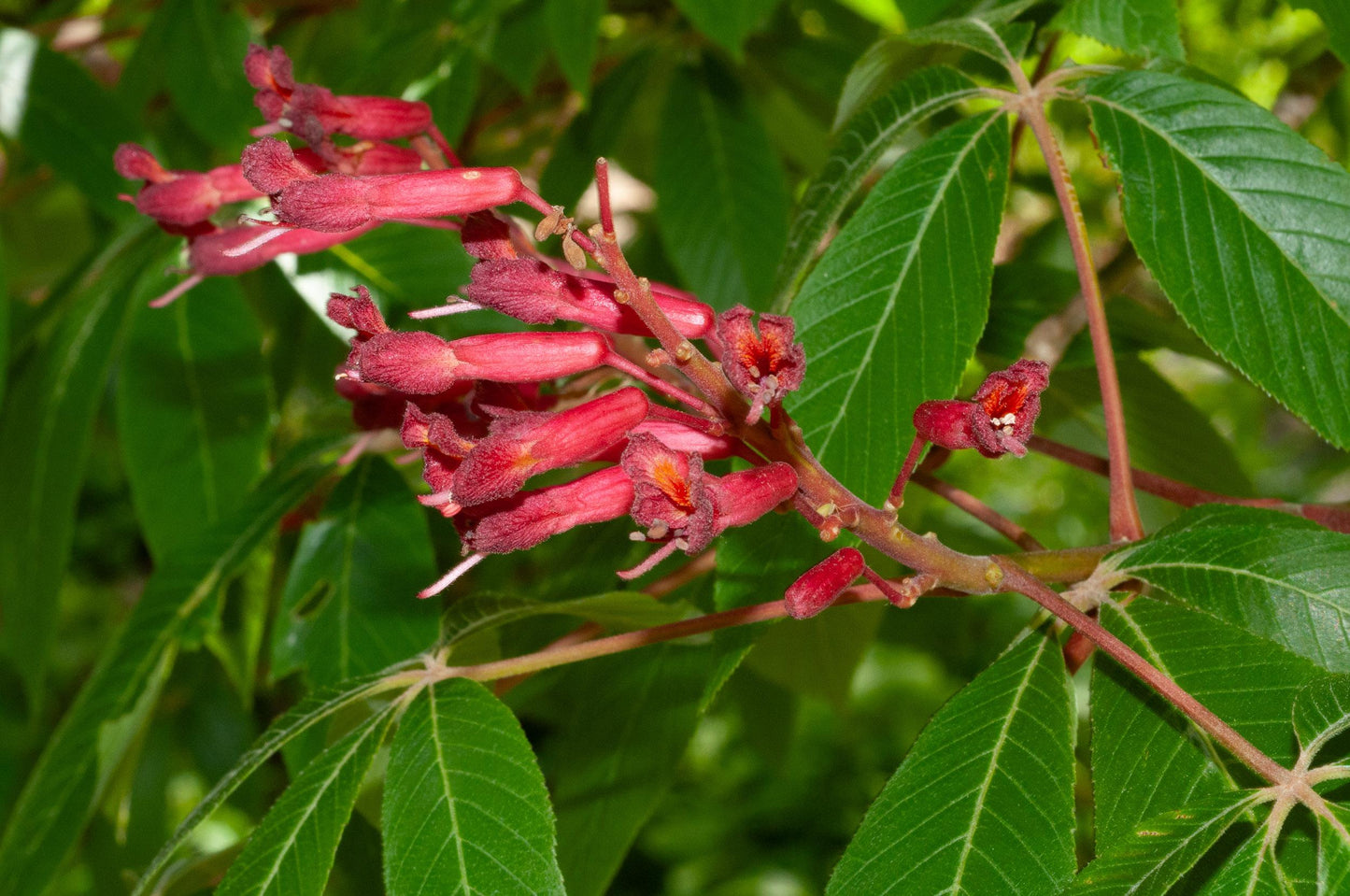 Aesculus pavia, commonly known as Red Buckeye, is a deciduous shrub or small tree known for its striking red tubular flowers that bloom in spring. It is native to the southeastern United States and is appreciated for its ornamental value and ability to attract hummingbirds and butterflies.
