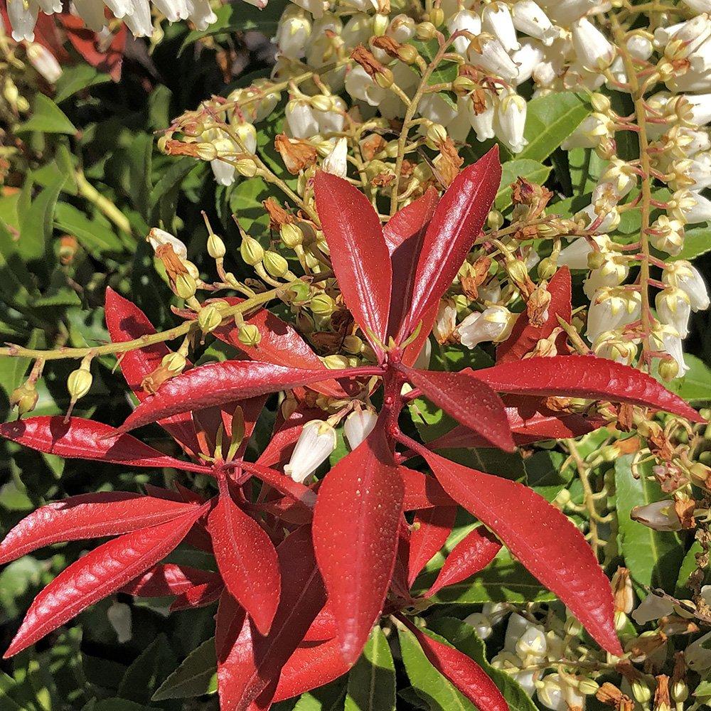 Pieris japonica 'Mountain Fire' is a stunning evergreen shrub known for its vibrant red new growth that matures to a glossy green. This plant adds year-round interest with its striking foliage and clusters of bell-shaped white flowers that bloom in early spring.