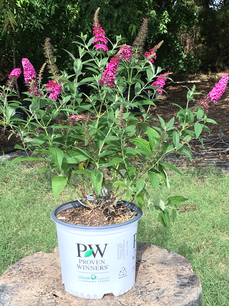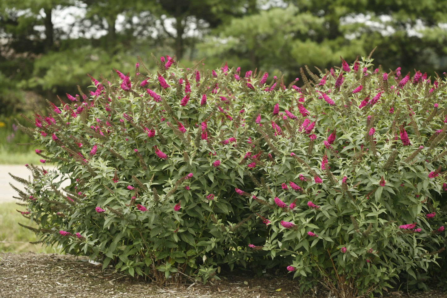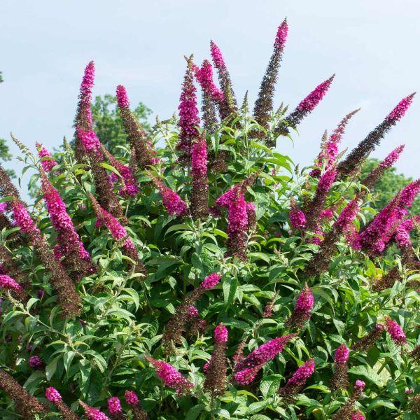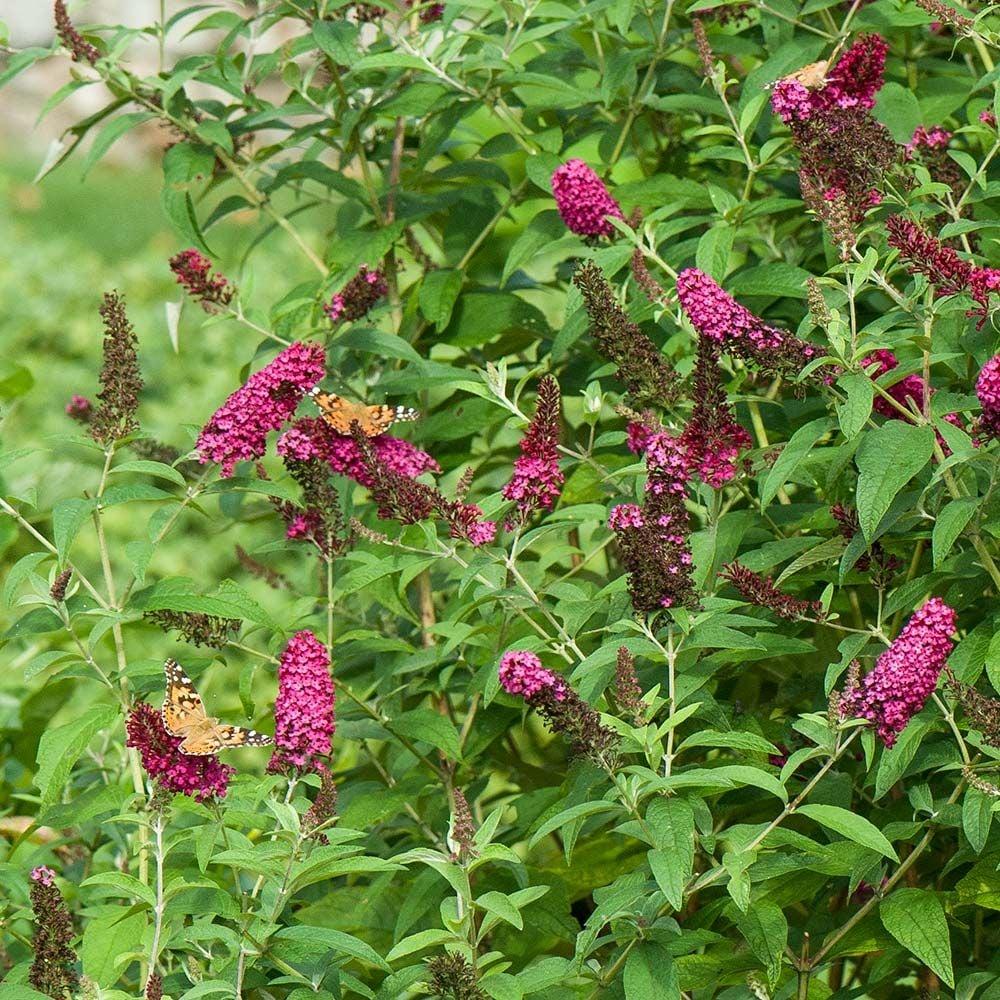 'Miss Molly' Butterfly Bush is a vibrant, compact shrub known for its striking magenta-red blooms. This cultivar is a favorite among gardeners for its ability to attract butterflies and hummingbirds, providing a lively display from mid-summer to fall.