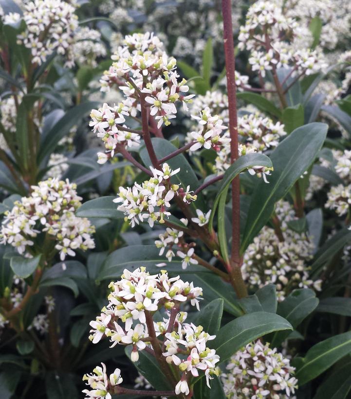 Skimmia japonica Male, commonly known as Japanese Skimmia, is a compact, evergreen shrub known for its attractive foliage and fragrant flowers. It is primarily grown for its ornamental value in gardens and landscapes.