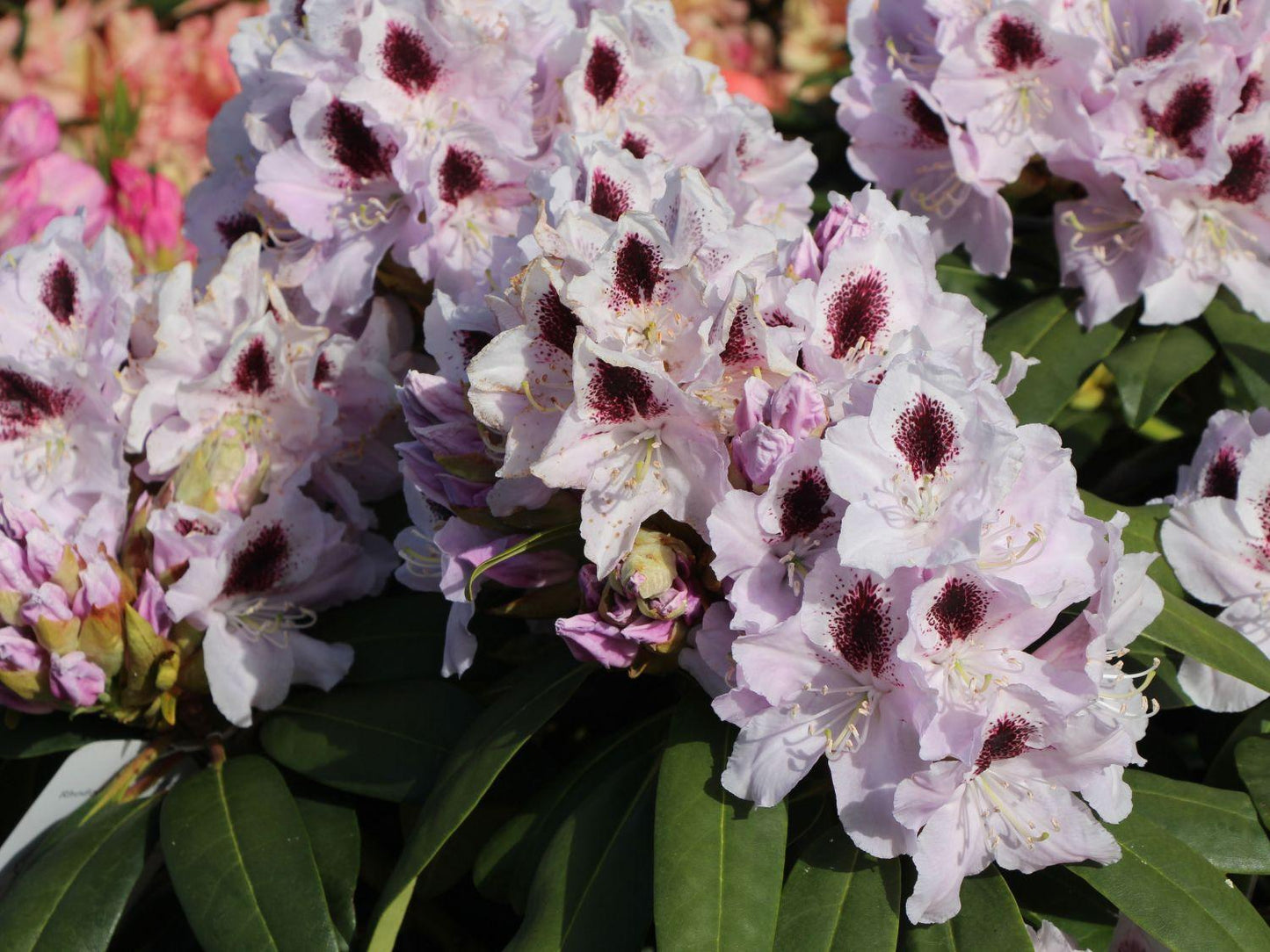 The Rhododendron 'Calsap' is a stunning evergreen shrub known for its large, showy clusters of white flowers with a distinctive purple blotch. This plant adds a dramatic flair to any garden with its lush foliage and vibrant blooms.