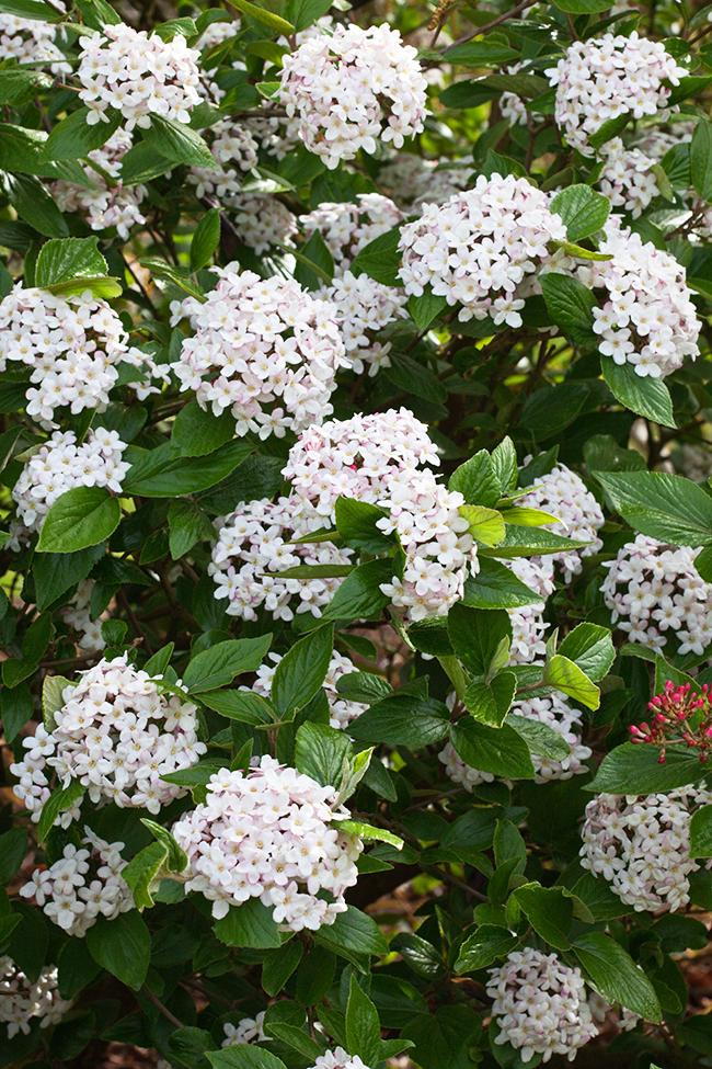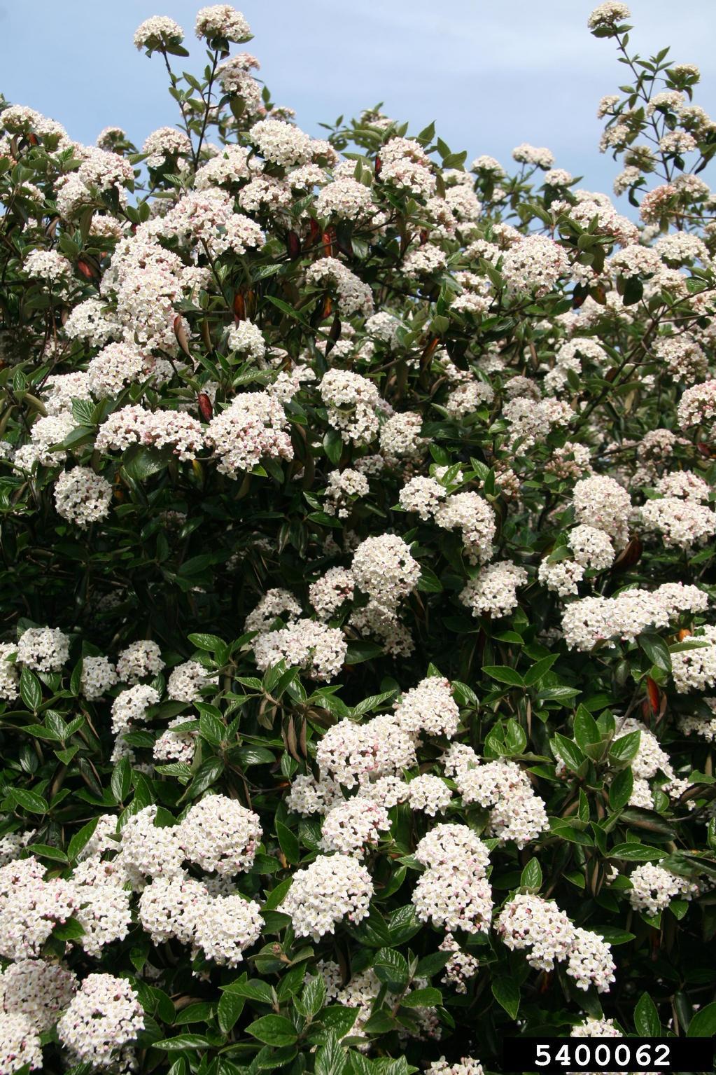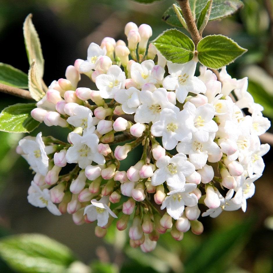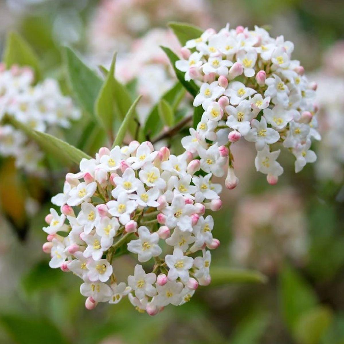Viburnum burkwoodii, commonly known as Burkwood Viburnum, is a semi-evergreen shrub known for its fragrant, white to pinkish blooms and attractive foliage. It is a hybrid species that offers a beautiful display of flowers in spring and often has a pleasant scent reminiscent of cloves. The plant is also appreciated for its glossy, dark green leaves that can turn a striking red in the fall.