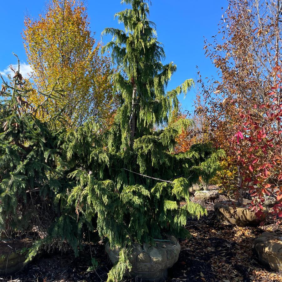 The Chamaecyparis nootkatensis 'Glauca Pendula', commonly known as the Weeping Blue Alaskan Cedar, is a striking conifer with a graceful, weeping habit. Its blue-green foliage adds a unique color to the landscape, making it a popular choice for ornamental gardens.