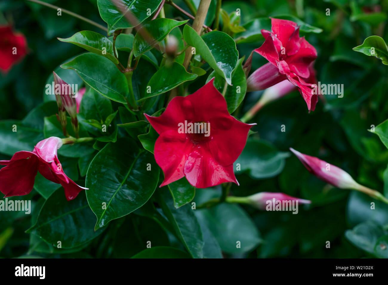 The Dipladenia, Red, Bush is a stunning tropical plant known for its vibrant red trumpet-shaped flowers and glossy green foliage. It is a versatile plant that can be grown as a bush or trained to climb, making it a popular choice for adding a splash of color to gardens and patios.