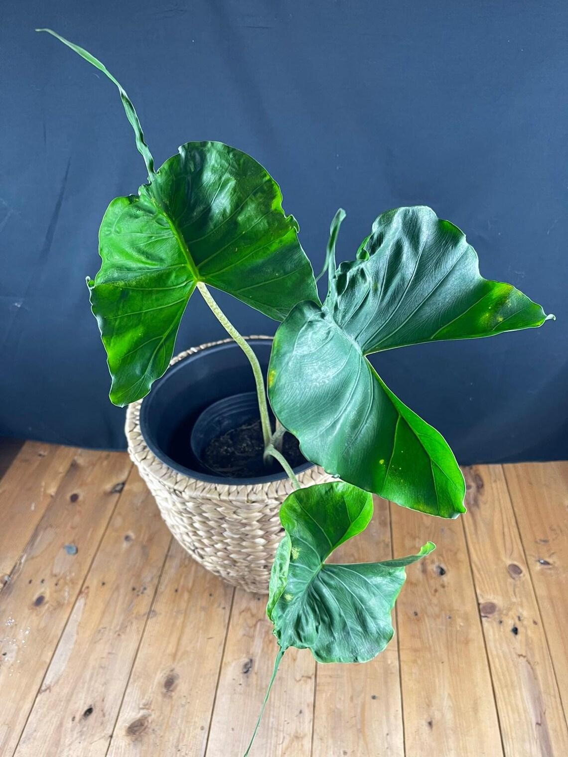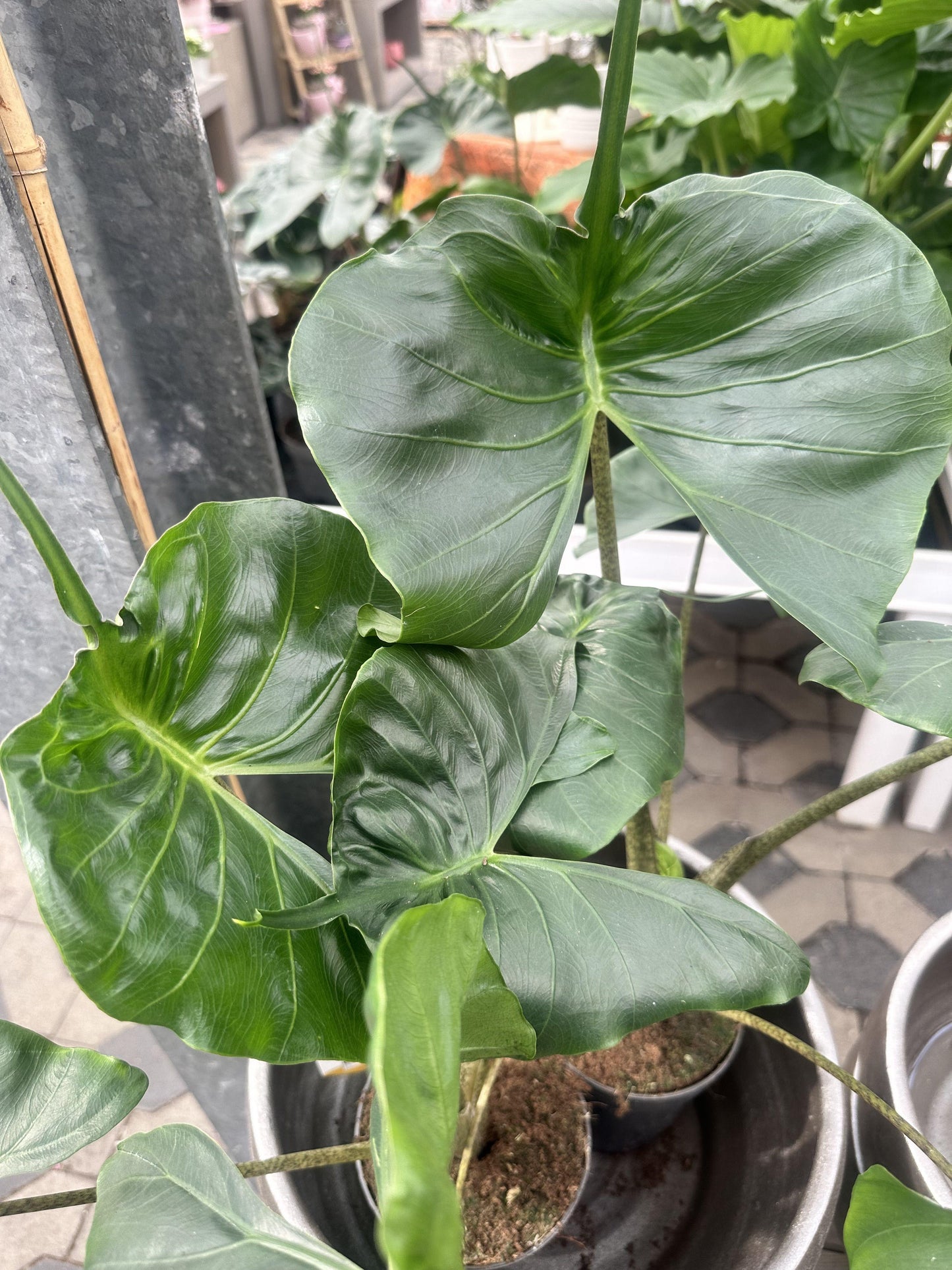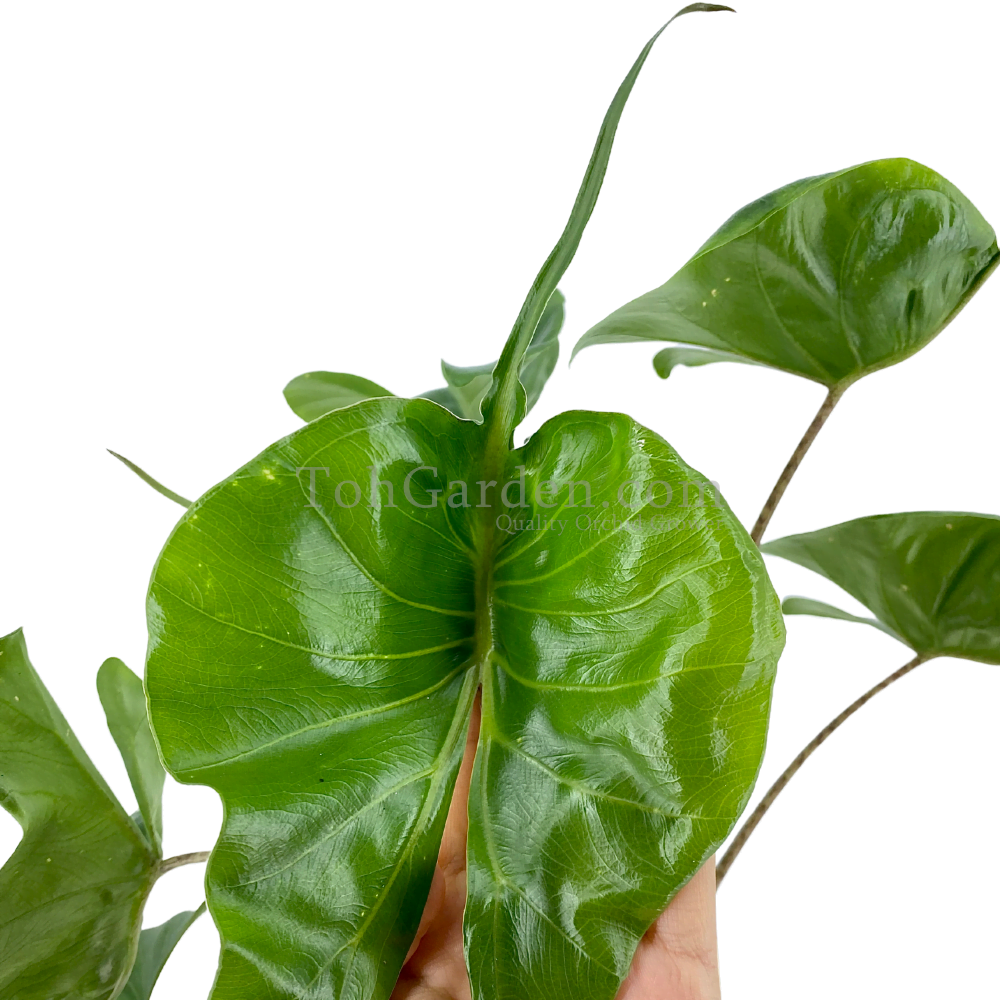 Alocasia 'Stingray' is a striking tropical plant known for its unique foliage that resembles the wings and tail of a stingray. Its glossy, deep green leaves are complemented by prominent veins and a distinctive tail-like tip. This plant adds an exotic touch to any indoor space or shaded garden area.