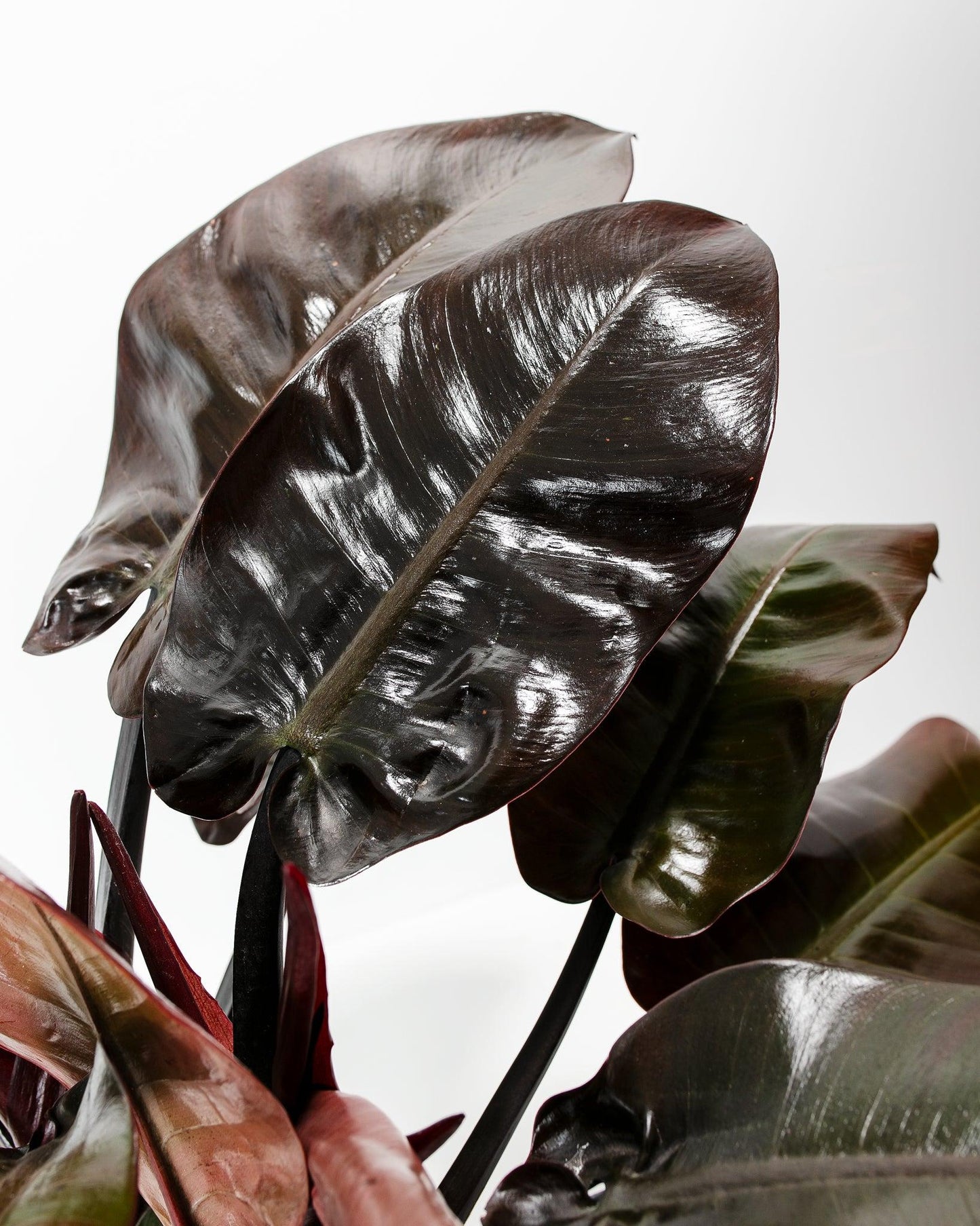The Philodendron 'Black Cardinal' is a striking tropical plant known for its dark, glossy leaves that transition from burgundy to black as they mature. This compact, slow-growing plant is perfect for adding a touch of drama to any indoor space.
