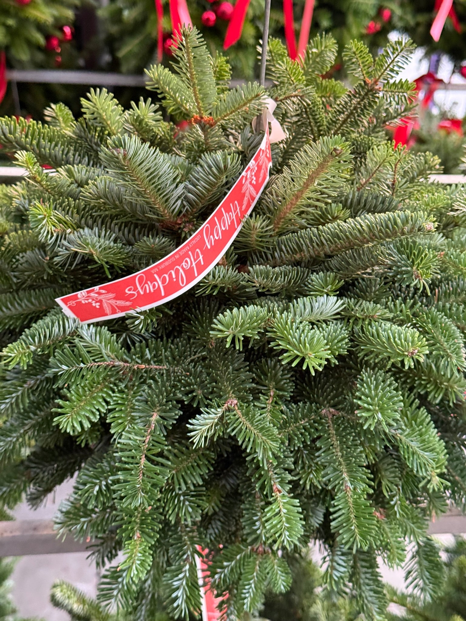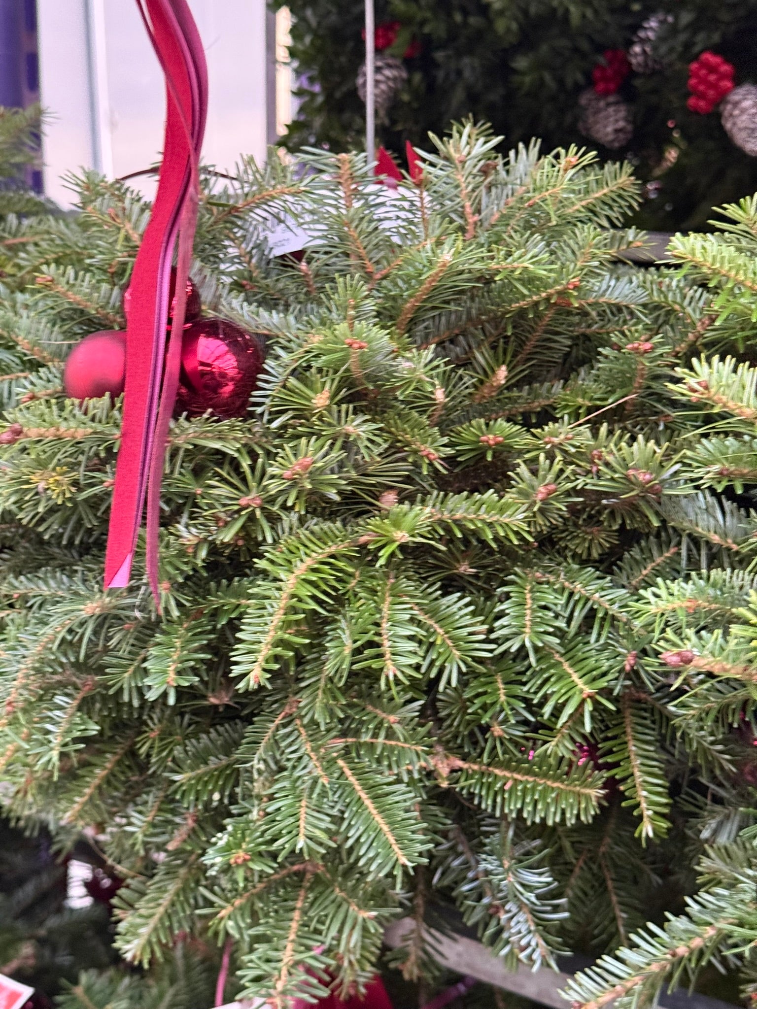 - Balsam and Fraser fir greenery in a burgundy tone.